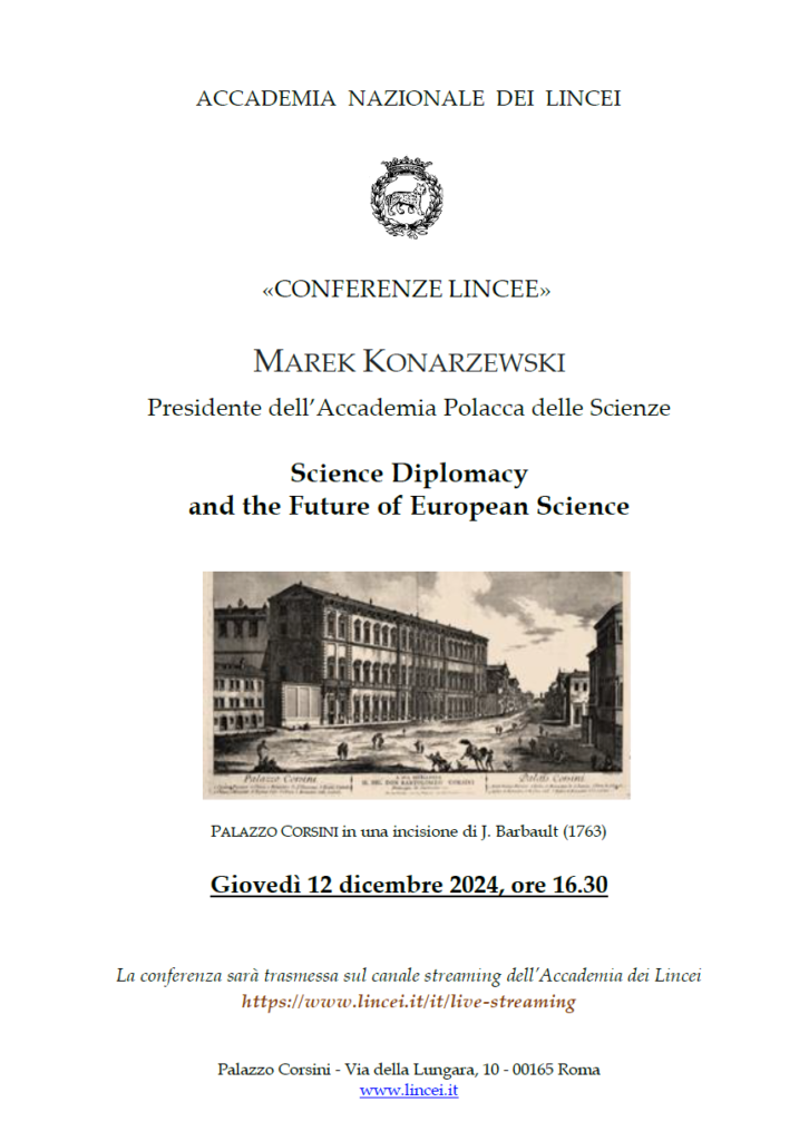 12 grudnia 2024 roku prezes Polskiej Akademii Nauk, profesor Marek Konarzewski, wygłosił wykład „Science Diplomacy and the Future of European Science” w Accademia Nazionale dei Lincei.