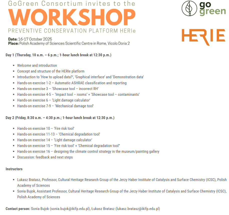 W dniach 16–17 października 2025 r. w Stacji Naukowej Polskiej Akademii Nauk w Rzymie odbyły się dwudniowe warsztaty szkoleniowe poświęcone platformie HERIe – cyfrowemu narzędziu wspierającemu decyzje w konserwacji zbiorów.