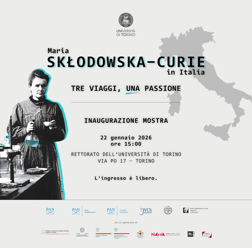Kontynuując swoją międzynarodową trasę, wystawa „Maria Skłodowska-Curie we Włoszech: trzy podróże, jedna pasja” zawita 22 stycznia do Turynu. Tym razem ekspozycja zyskuje nową odsłonę w stolicy Piemontu, ważnym punkcie na mapie podróży Marii Skłodowskiej-Curie we Włoszech.
