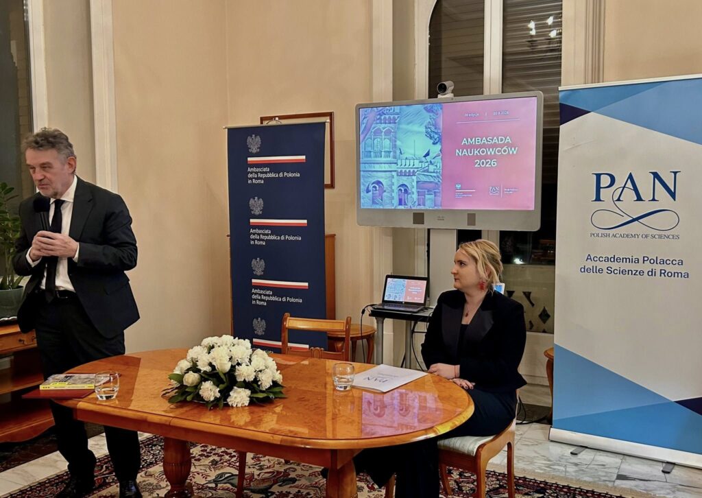 Dnia 20 lutego 2026 r. w siedzibie Ambasady RP w Rzymie odbyła się czwarta edycja „Ambasady Naukowców” – wydarzenia będącego owocem współpracy pomiędzy Ambasadą i Stacją Naukową PAN w Rzymie, które ma na celu stworzenie możliwości nawiązywania kontaktów w środowisku polskich naukowców pracujących we Włoszech i włoskich badaczy zajmujących się badaniami o Polsce. Spotkanie, zorganizowane z okazji Dnia Nauki Polskiej, zgromadziło blisko 30 badaczy i stało się przestrzenią do wymiany doświadczeń oraz prezentacji różnorodnych kierunków badań – od fizyki i sejsmologii, przez historię i ekonomię, po nowe technologie i sztuczną inteligencję.