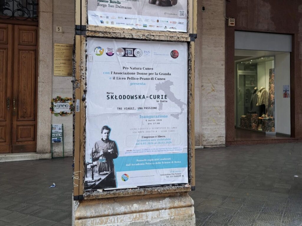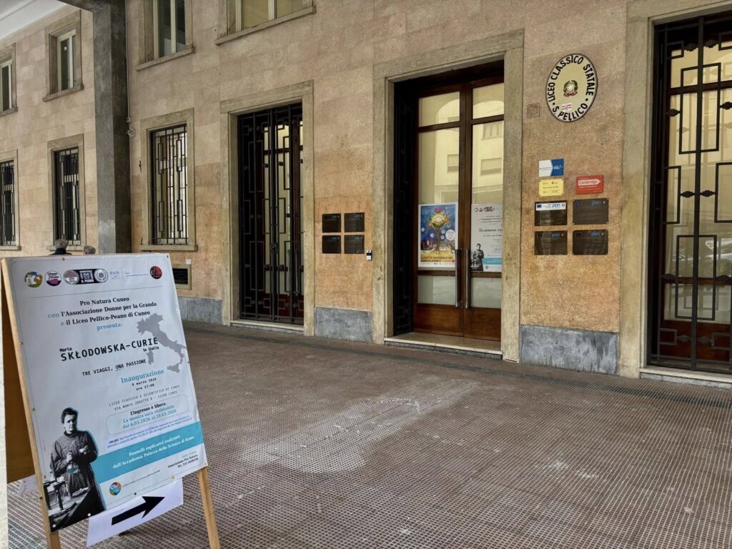 W okresie od 6 do 28 marca 2026 roku, w Liceo Classico-Scientifico w Cuneo będzie prezentowana wystawa „Maria Skłodowska-Curie we Włoszech: trzy podróże, jedna pasja”. Edycja wystawy w Cuneo została zorganizowana przez Pro Natura Cuneo we współpracy z Stowarzyszeniem Donne per la Granda oraz Liceum Pellico-Peano w Cuneo. Celem wydarzenia jest przybliżenie życia i osiągnięć tej wybitnej chemiczki i fizyczki, laureatki dwóch Nagrody Nobla, której prace miały fundamentalne znaczenie dla rozwoju nauki na początku XX wieku.